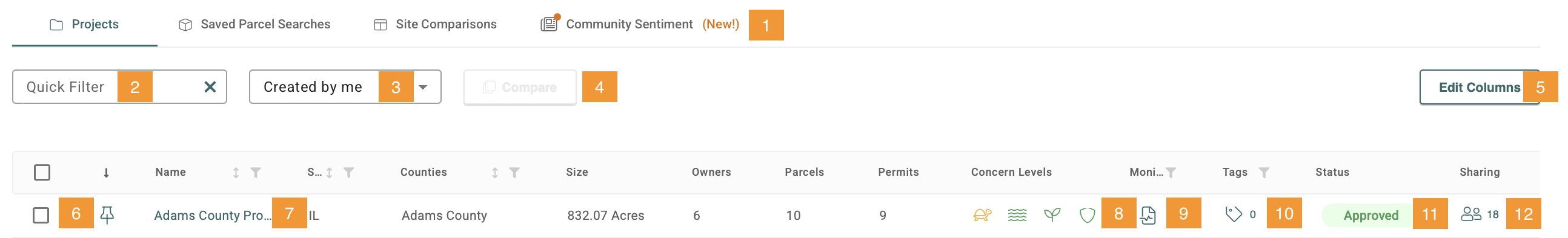 - Projects/Saved Parcel Searches/Site Comparisons/Community Sentiment: View the different projects you've created by choosing between Projects, Saved Parcel Searches, and Site Comparisons. Community Sentiment delivers a personalized feed of news articles about solar, wind, and storage developments in the very areas you're evaluating.