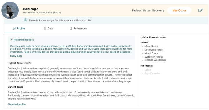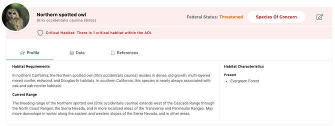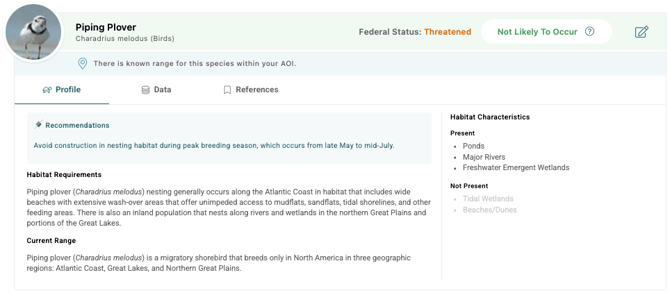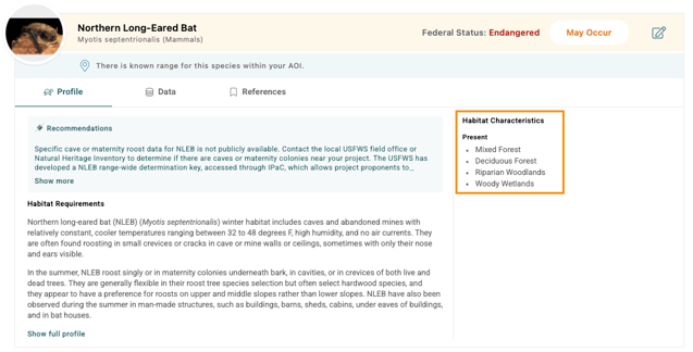 Habitat characteristics are assigned to each species profile by the Transect Environmental Team based on various datasets (waterways, wetlands, landcover, and more). These characteristics appear under the Profile tab of each species and indicate whether a habitat characteristic is “present” with a ✓ or “not present” with an X.