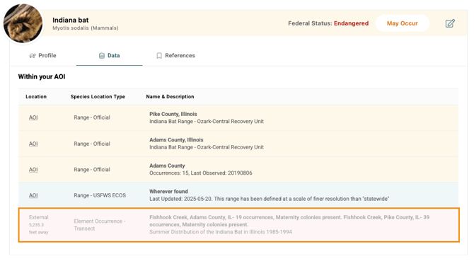 Your Transect Report includes species found within both the AOI and buffer, as well as elemental occurrences within 3 miles of your project, to offer helpful context on species movement near your AOI. Click the row to populate a vector on the map where the species was located.