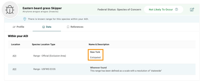 Exclusion areas are those areas where the species has been definitely determined as extirpated (species no longer exists in a specific region) or absent from an area. If Transect only shows exclusion areas for a species on your AOI, then the species concern level will be downgraded to 'Not Likely to Occur.'