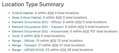 Your Transect Report includes many different resolutions of species location types that intersect with your project area of interest (AOI) or buffer. This location data in a Transect Report can be viewed in two ways: