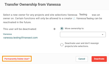 To permanently delete a user from your account, you'll change their "Status" to "Deactivated." You'll see the pop-out shown below, where you can select Permanently Delete User. You'll transfer the ownership of any projects, reports, and site selections, then confirm by selecting Delete.
