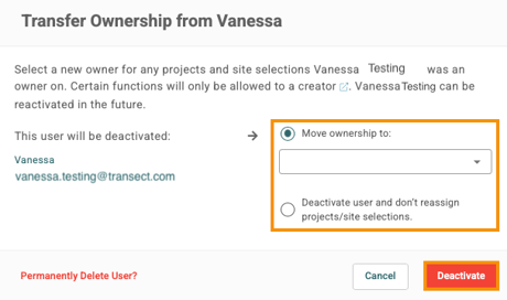 A pop-up will confirm if you want to transfer that user's projects to another owner, or deactivate without reassigning their projects. After making your selecting, click Deactivate to finalize the process.