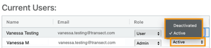 As users shift between roles within your company, you may need to temporarily deactivate some users and activate others within your allotted seats. This can be easily done by selecting the dropdown next to the user's name and choosing Deactivated.