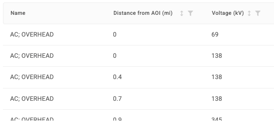 View the name, distance from the Area of Interest (AOI), and voltage of nearby lines.