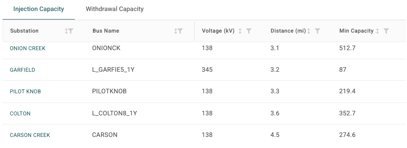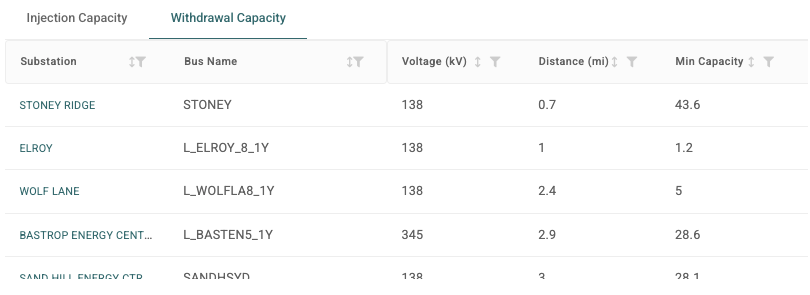 Organizations with access to the Interconnection feature will also have access to both the Injection Capacity and Withdrawal Capacity (ERCOT only) layers. First, add these layers to the Map, and then check the box to activate the applicable layer. To view more information, simply right-click that feature on the Map. Please note that only one of these layers can be activated at a time.
