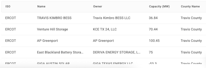 At the bottom of the Interconnection page, you'll find Interconnection Queue Data for projects in the same county as your AOI. This data, provided by the ISOs, includes the owner, capacity, status, projected COD and additional information about projects that are close to your area of interest.