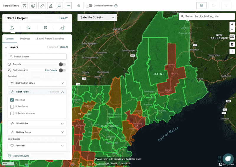 - “Your Site Selection” Side Modal: Create a project area in the Map to showcase Pulse scores for relevant jurisdiction(s) in the side modal.