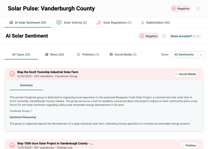 AI Sentiment: The Sentiment tab highlights the aggregated sentiment score within each of your project area’s jurisdiction(s), with a list of the news articles and their individual sentiment scores, sources, brief summaries, score reasoning, and links. You'll also see tabs for Petitions and Social Media, which provide a broader take on what opposition may be like in your area of interest. The Stakeholders and Opposition Points tabs provide valuable insights about the local people or organizations influencing public sentiment and their primary reasons for opposition, if any.