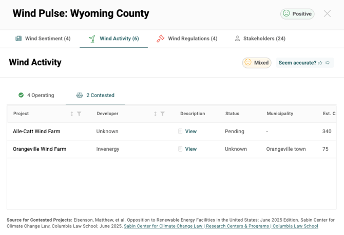 If a jurisdiction has contested solar, wind, or battery projects, the Contested tab will become visible. Simply click the View button under the "Description" column to read a summary and access links to relevant sources.