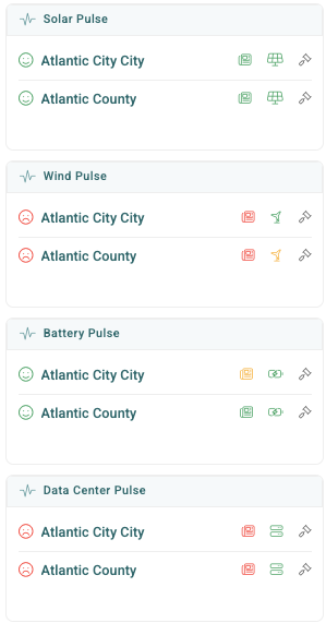 We refresh our AI Sentiment data weekly, project data monthly, and regulations data monthly. - How are you calculating a given jurisdiction’s overall Solar / Wind / Battery / Data Center Pulse score?