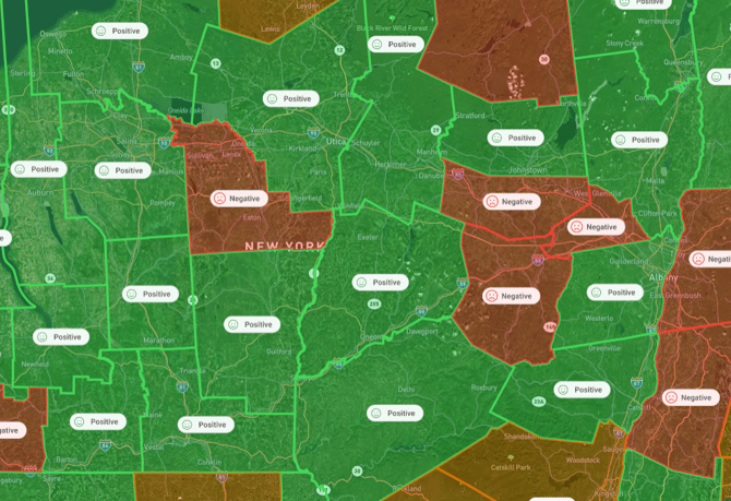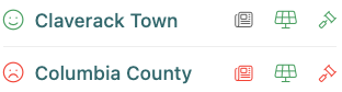 Next to the county or sub-county's name, you’ll see color-coded iconography that indicates whether the rating is positive (green), mixed (orange), negative (red), or unsure (gray). You can click the icons to be routed to other sub-pages: