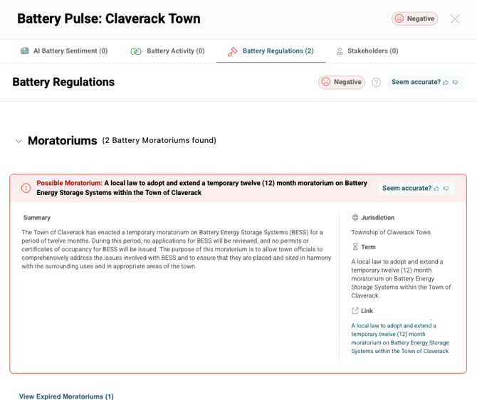 Regulations: On this report sub-page, you’ll find a list of any moratoriums or ordinances we’ve collected for the jurisdiction(s) where your project is located. You’ll see summaries of these regulations, links to the source docs, and an option for “Expert Verifications” of moratoriums, for no added fee.