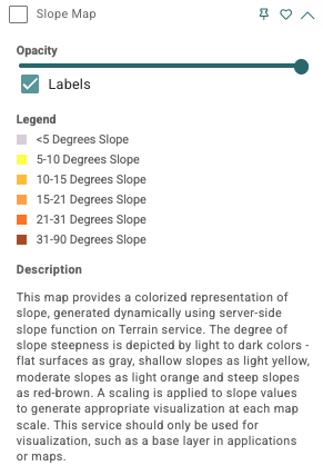 : select the dropdown arrow for additional settings, including adjusting the opacity of the layer, adding labels to the map, and viewing the legend and description.