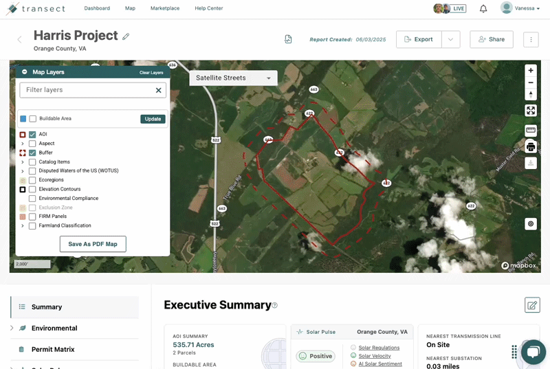 Report Buffers are added when creating your Transect Report by dragging the radio dial or adding a value in the context box for your preferred distance (in ft). Please note that the maximum buffer is 5280 ft (1 mile).