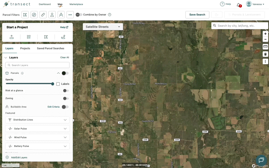The Parcels layer will automatically activate when using Quick Parcel Select in the Map, where you can toggle to activate the Risk at a Glance to visualize the associated risk for each selected parcel.