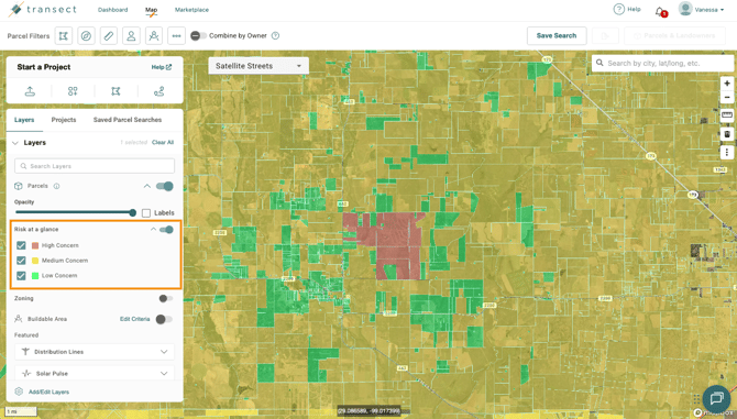 With the "Parcels" layer activated, you can select the toggle to activate “Risk at a Glance." This will color-code each parcel as Low, Medium, or High Concern, which can be filtered by selecting the checkboxes.