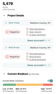 Once a boundary has been created using the Parcel Filter, the “Site Selection” modal will populate on the right side of the page. This modal displays the selected parcels' concern levels (low, medium, high) as percentages. Users can also select the toggle to include Water Concerns for additional insights. Check out this article for more information on the Parcel Filter.